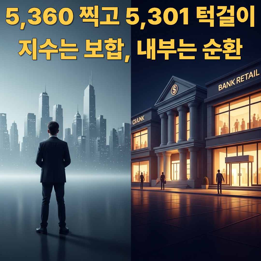 “5,360까지 갔다가 5,301로 돌아온 날—상승의 주인공은 대형주가 아니라 ‘배당·정책 순환매’였고, 코스닥은 외국인 매도에 밀렸다.”